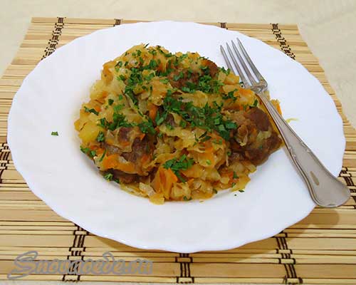 тушеная капуста с мясом и картошкой на сковороде Капуста – это низкокалорийный и универсальный овощ, который можно не только жарить, тушить, но и запекать, а также варить.И даже в свежем виде, например, салаты со свежей капустой, дадут вам возможность насытить организм полезными веществами и витаминами. Тушеная капуста с мясом и картошкой на сковороде – питательное и вкусное второе блюдо. Вообще, рецептов тушения капусты с мясом много, но мы рассмотрим один из самых простых. Ингредиенты капуста белокочанная (средний размер) – 1/2 шт., репчатый лук (средний размер) – 1 шт., картофель (средний размер) – 3-4 шт., морковь (средний размер) – 1 шт., мясо (телятина или свинина) – 9-10 кусочков (примерно 200 грамм),…