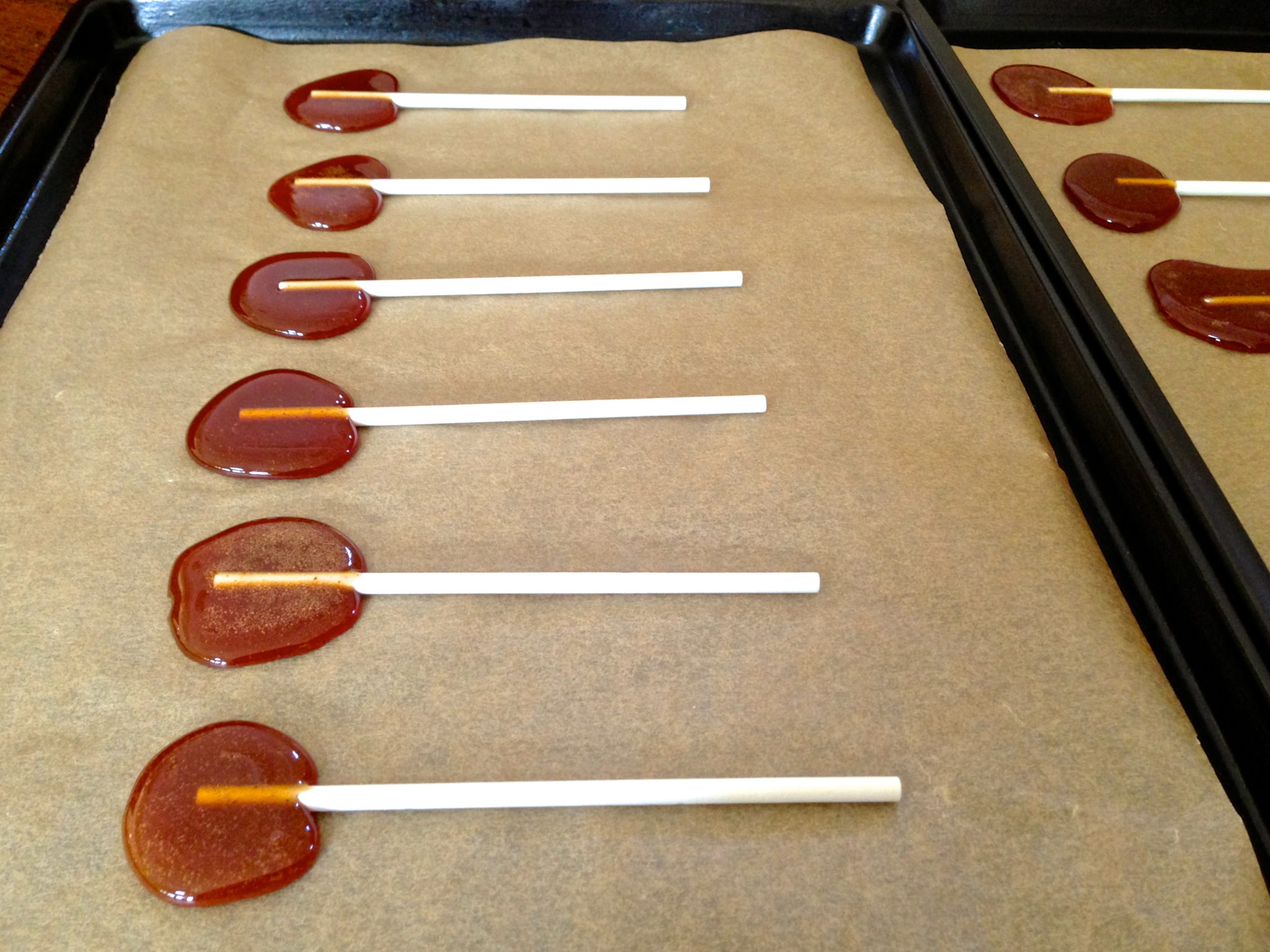 Заранее приготовленные формы промазываем маслом и вливаем в них полученный сироп. Через несколько секунд втыкаем в еще горячие леденцы палочки и оставляем до полного охлаждения в покое (примерно на полчаса-час).