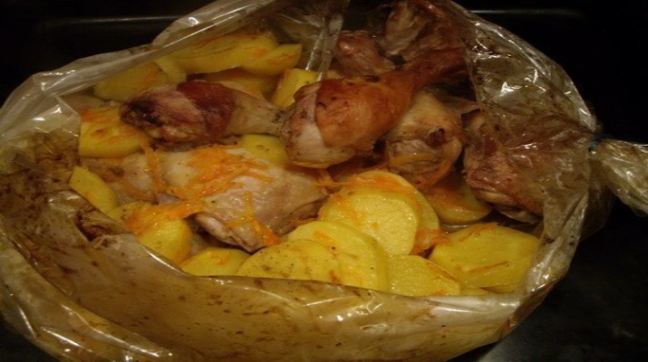 Купить продуктыКак правило, для этого блюда выбирают голени или бедра птицы. Рукав сохраняет все соки мяса и пропитывает ими картошку. Не стоит увлекаться специями, можно только посолить и поперчить блюдо — оно и так получается очень вкусным и самодостаточным. Можно добавить разве что немного карри или орегано.
