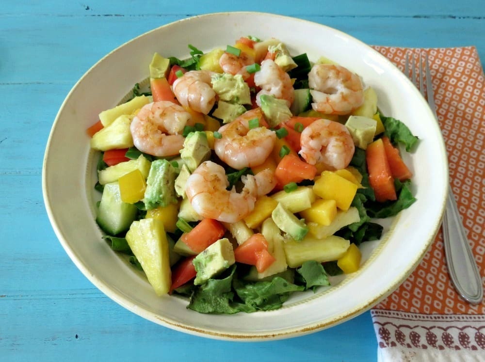 Подайте гавайский салат с креветками на зелени и наслаждайтесь!